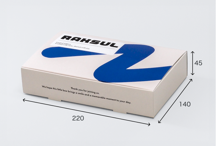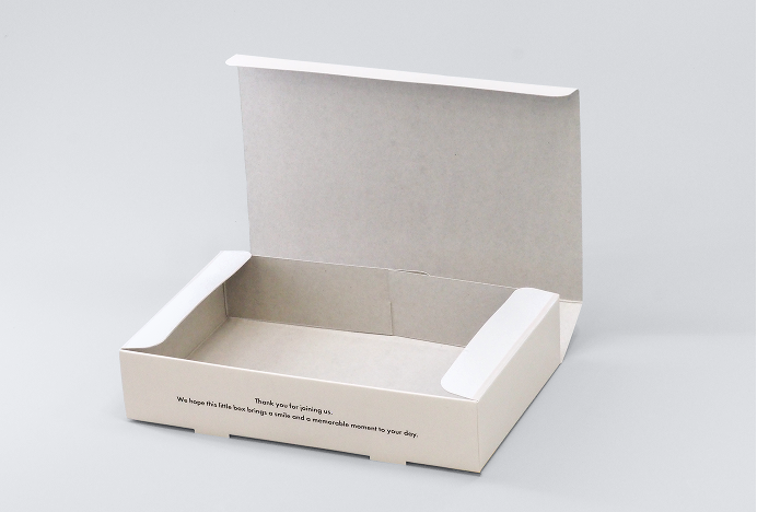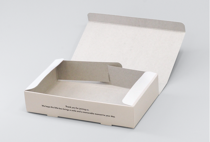イベントや店頭で菓子・雑貨を入れて平置きし手渡す箱として適したN式箱です。平の状態で納品されます